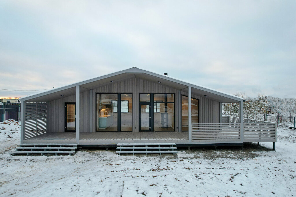 Это дом для постоянного проживания площадью 108 м2 с большой гостиной и тремя спальнями. Цена указана за полностью готовый дом с фундаментом и доставкой.