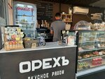 Я в Венёве бываю 2 раза в год, ~95% нахожусь с Санкт-Петербурге и пользуюсь их местными кофейнями разного "калибра" и сравнить есть с чем, так вот: Кофе - прекрасный, готовят быстро, очень вкусно, цены адекватные. Обратился, чтобы добавили сиропа - добавили без вопросов и бесплатно. Пончики (донаты) - свежие, вкусные, что ойойой! Ценник, также, адекватный. Макаруны (макарони/макарунс) - свежие, средние по размеру, ценник, также, адекватный. Попробовал за долгое время все имеющиеся, доволен, как слон!:) Заходите, не пожалеете. Атмосфера добрая, ламповая, тихо и приятная ненавязчивая музыка. Имхо, самое лучшее место в Венёве для тихих безалкогольных посиделок:) На момент написания отзыва в "Орехе" работают 2 баристы: Ахмет и Александр. Оба очень приятные, отлично выглядят, ведут себя учтиво, обрабатывают заказы четко и быстро. Доводилось общаться на побочные темы с ними (по личной инициативе), разговором доволен. Заслуженные 5 звезд и персоналу, и ассортименту, и заведению!)