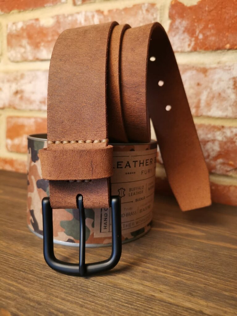 Кожаный ремень. Из ременной, специально выделанной кожи буйвола, толщиной не менее 3.5 мм. Выделка жесткая, кожа плотная, ремень хорошо держит форму, не деформируется и не растягивается. Пряжка тяжелая, из 100% нержавеющей стали с матовой браширован