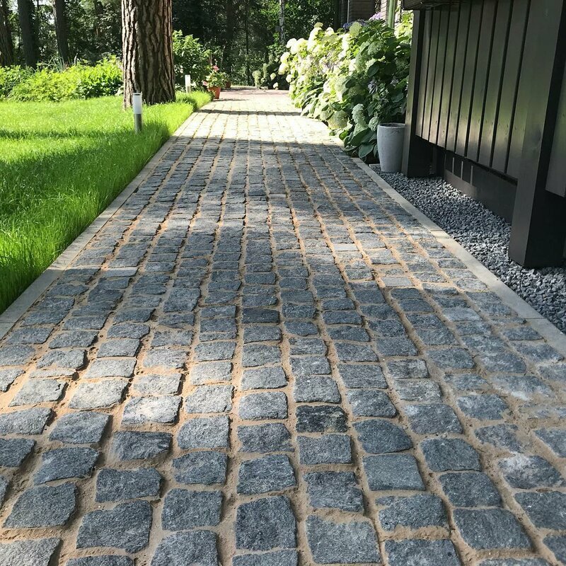 Гранитная брусчатка используется для создания садовых дорожек любой ширины и длины, тротуаров, дорог, площадей, дамб. Мощение натуральным камнем улучшит внешний вид прилегающей территории вокруг загородного коттеджа, дома или офисного центра.