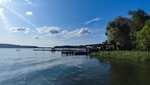 Из плюсов: локация, парковка, чистота на территории, отличные туалеты, приличное кафе. Минусы: прокат. Мы были в будни, и прокат весельных плавсредств, к сожалению, был закрыт, а в прокате моторок персонал грубый и цены высокие. Более того, в какой-то момент работники проката вдруг возомнили себя «хозяевами пирса» и запрещали отдыхающим спускаться с него в воду, хотя там явно для этих целей оборудованы лесенки. Это, конечно, не испортило нам отдых, но осадочек остался и заказывать у них прокат теперь нет никакого желания. Еще минус - кафе не всегда справляется с наплывом посетителей и иногда приходится подолгу ждать возможность заказать еду.
