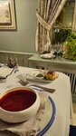 Меню выдали быстро, а дальше про меня забыли минут 15, на просьбу принять заказ, официант кинул через плечо щас и умчался в прекрасное далеко. После принятия заказа еду пришлось ждать 30 минут. Еда. Борщ был отличный. А вот драник больше напоминал на чипсы, был прям хрустяще твердым. Ни спасла его ни икра, сметана. В общем разочарование. Две звезды только за борщ. Все остальное ниже ватерлинии. Upd пока мы ели за спиной ругались официанты