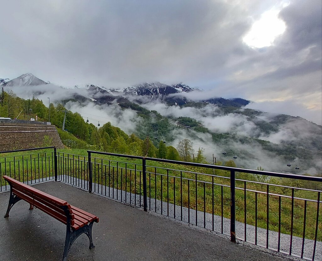 Лучшее место в Олимпийской деревне для просмотра закатов и туманов. Причем в любое время года! Берите пуховики, пледы, винишко и бокалы, горячий чай в термосе и любимых людей. Обязательно берите любимых людей - горы с ними вдвойне прекрасней! И приходите сюда, посидеть на лавочке, глядя на вечный бег Мзымты в долине, работу Олимпии, машины на серпантине внизу.