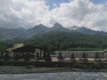 Прекрасная видовая площадка у порога отеля с красивым названием. Отличные виды в сторону вершин Ачишхо(2391 м) и Чугуш(3238 м). Как ни странно, обе располагаются в системе Главного Кавказского хребта. По крайнем мере, на Водораздельном точно. Здесь эта граница резко меняет направление ГКХ на юг и перескакивает на более низкие горы. Чтобы лучше увидеть снежники к востоку надо немного пройти к станции Олимпия 1100 м. Где хорошо видна другая часть Большого Кавказа и Турьи горы.