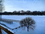 Зимой на площадке из людей практически никого нет. Вид на замерзшую и незамерзшую после моста часть реки Москва. Особо каких-то необычных и интересных видов, нет