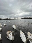 Beautiful view. Swans are swimming, people are walking along the embankment. There is a beautiful park nearby.