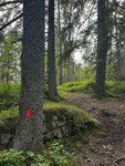 Тропинка идет вдоль ручья и поворачивает налево. От Никольской улицы поселка Красная горка до смотровой площадки всего 500 метров и 10 минут ходьбы. Подъем не сложный. На деревьях есть маркировка чтобы не сойти с тропы.