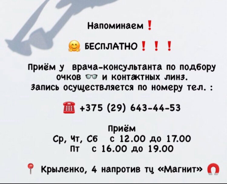 Wonderful optics! Competent and courteous staff, patiently and clearly advised, answered all questions. Very fast and high-quality production of glasses! I was pleased with the wide range of frames and very pleasant prices. I came to Mogilev from Minsk to get glasses and I will be happy to come back again! Thank you for such a sensitive and attentive attitude to customers!