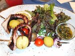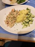 Посещали 27.06 на ужин. Девочки-хостес приветливые. Официант Ширали проконсультировал по блюдам и мы заказали: 1. Мини чебуреки с креветками и кальмаром со спайси соусом - вкусные и соус подходящий. Поданное блюдо соответствует фото. 2. Мимоза с копчёной северной треской, бурым рисом и домашним майонезом - интересное и вкусное сочетание ингредиентов. 3. Хрустящие баклажаны с томатами 4. Фишстроганов с картофельным пюре и малосольным огурцом - блюдо отличается от фотографии в меню, но только в части оформления, очень вкусное ассорти рыб под сливочным соусом, пюре было нежное, огурчики как по домашнему. Из всех заказанных блюд это на первом месте. 5. Запечённый волжский судак с заварным сырным соусом и томатами - поданное разительно отличается от заявленного, но от этого он не стал менее вкусным, внешний вид оказался обманчив и блюдо было очень вкусным. Все блюда понравились, рекомендую!