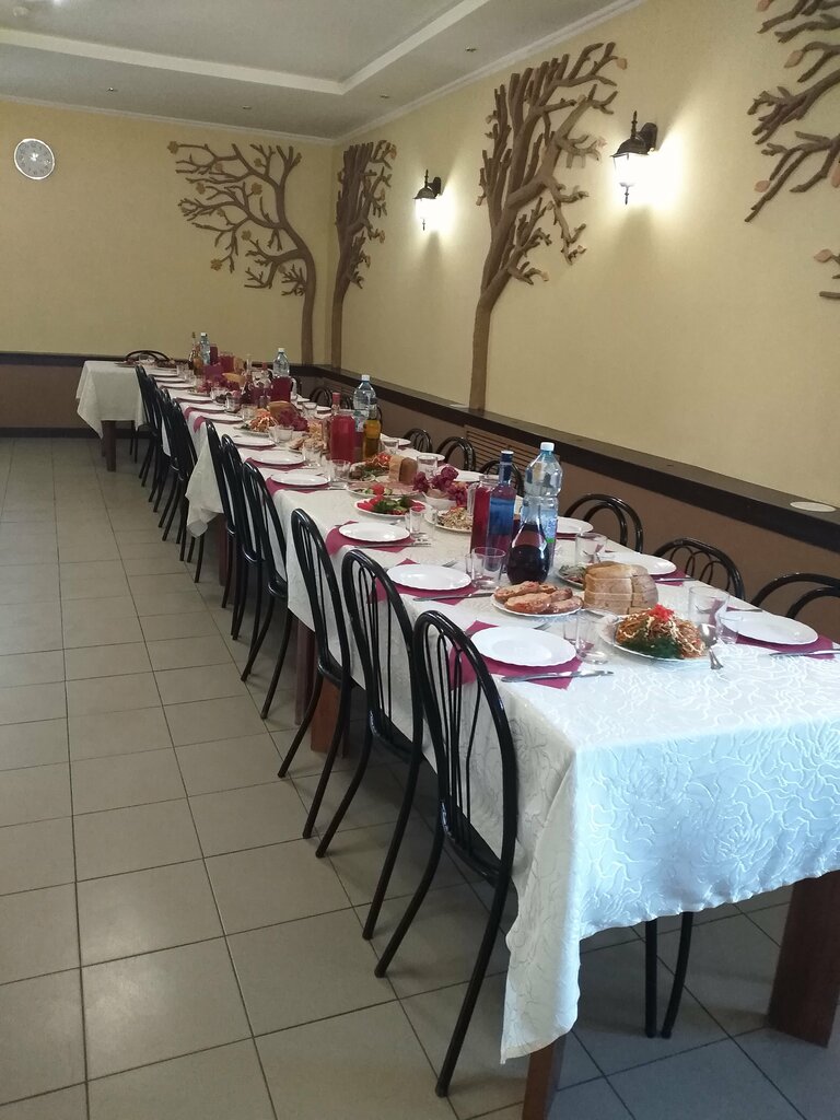еда была не очень, курица будто заветренная, непонятные рецепты, сам зал тоже такой, стол не очень большой, на небольшую компанию хватит, всё старое, нет ни колонок для музыки, ни телевизора на котором можно было бы включить музыку или ещё что то, в туалетах не закрываются на замок двери. ну для дня рождения или ещё каких то праздников точно не подойдёт