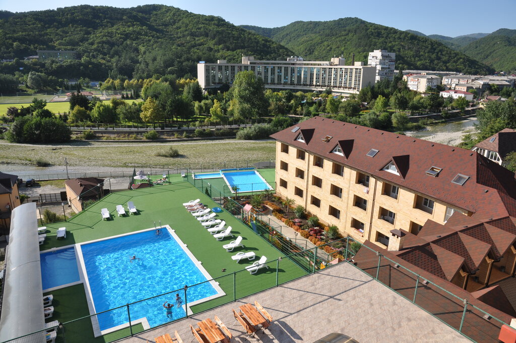 Отличный отель, отдыхали там 3 денечка. Теретория большая за эти дни всю не обошли . Номера чистые , через день убрали мусор , вытерли подоконники ( за ночь там очень много собралось мошек) . мы даже не просили , чтоб убрались . что очень удивительно. Бассейн с подогревом, сауна и хаммам работают с 11 до 18 . но этого хватает попариться 👍.Бассейны чистые , глаза не болят после него. Всегда есть выбор на какой пойти на верхний или нижний. Рядом детские площадки. Одна крытая, другая нет. Столовая не дорогая были пару раз , есть из чего выбрать. Парковка есть платная 300 рублей за сутки. И есть бесплатная возле двора под камерой. Территория вся в цветах, ухоженная. Девочки уборщицы как феечки без остановки убираются. Иногда даже их жалко. Есть конечно минусы когда звонили и бронировали говорили что мыло , шампунь , тапочки все в номере будет. По факту 2 пачки шампуня и мыла на четверых . пришлось искать шампунь в ближайшем магазине и покупать все это. Может для кого-то это и мелочь , но извините если заявили , то будьте любезны положите. Но и дороговато для 3 звёзд. За 10 000 рублей можно включить хотя бы завтрак.