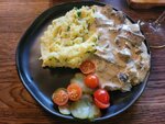 Еда из 2–х блюд что я попробовала 1) щечки мелко нарезанные с прожилками и вкусом субпродуктов, картофельное пюре холодное но есть можно 2) Фиш энд чипс - вкусная картошка неплохой соус, но вместо рыбы один кляр. 3) кофе вкусный 4 ) пиво неплохое