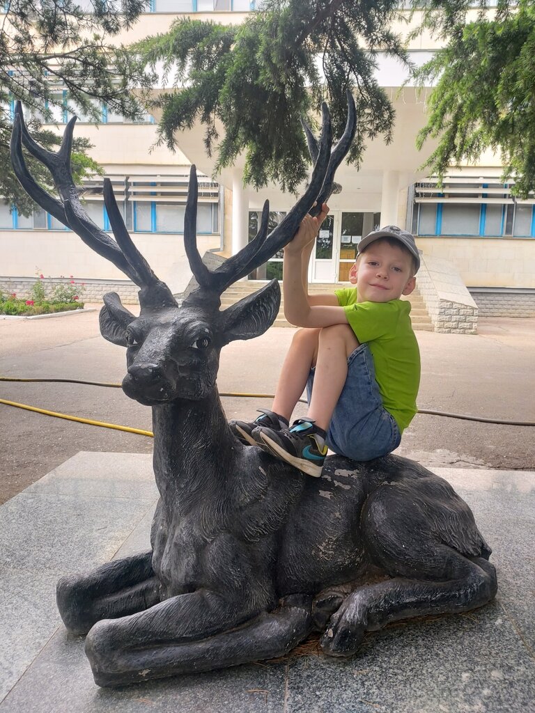 Фотозона при входе в дендрозоопарк и музей природы. Красиво сделали оленя - символ природы Крыма. Только надо осторожно с ним фотографироваться, чтобы не поломать. За этим оленем в здании можно оформить пропуск и съездить на экскурсию в горы. Где форелевое хозяйство, монастырь, беседка ветров, музей партизан, охотничий домик Брежнева.