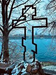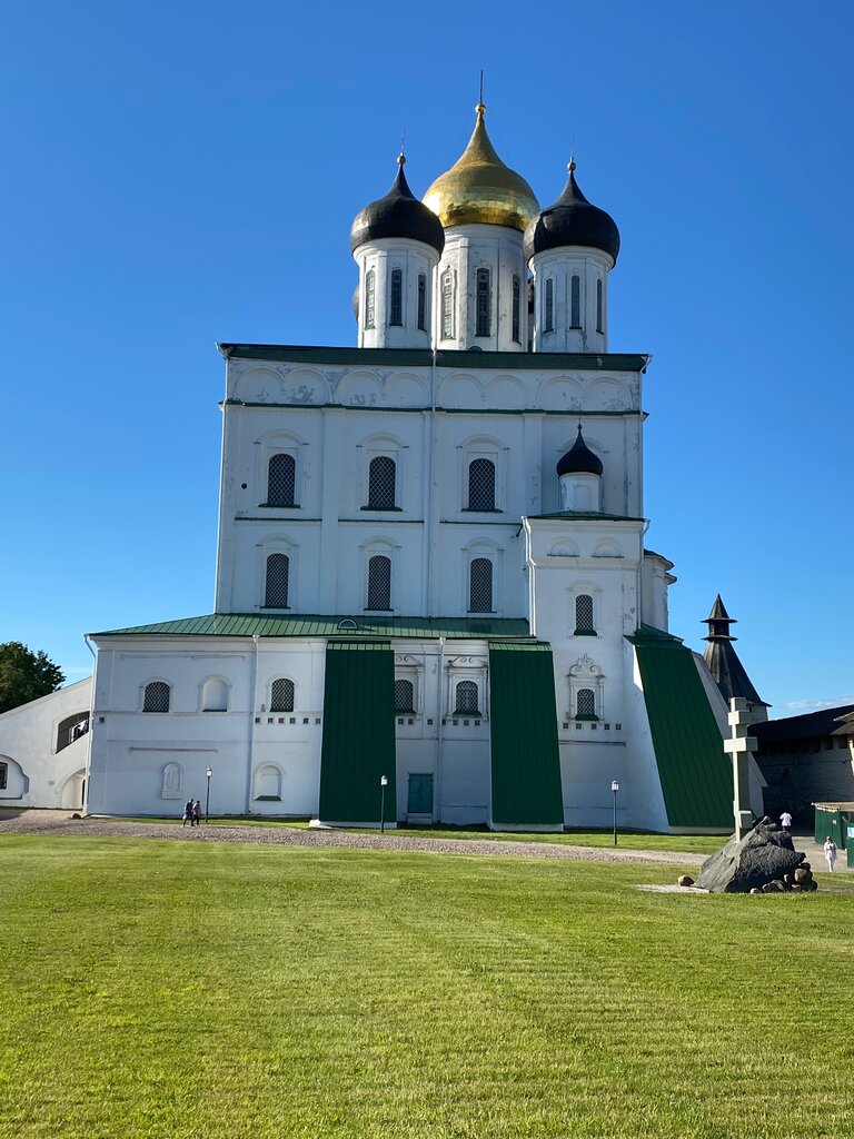 Ольгин крест установлен на берегу реки Великая у часовни княгине Ольге 24 июля 1991 г. Своими очертаниями он идентичен сгоревшему 15 мая 1609 года дубовому кресту, который в былые времена установила княгиня Ольга. Туристы часто делают фотографию с великолепным видом на Троицкий собор через абриз креста. Но необходимо отметить, что место установки креста, возможно, выбрано ошибочно. Три световых луча Ольга увидела «на устии» реки Псковы, находясь в укреплении викингов, которое было расположено на месте домов Ольгинская набережная 1а и 1б. Рекомендую прогуляться ещё и туда, благо это совсем близко и посмотреть вид открывающийся оттуда.