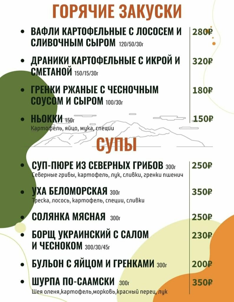 Меню обычное. Ждать меню, а потом заказ в совокупности можно и час. Приходится постоянно напоминать о себе. Официанты - совсем молодые люди, не владеющие информацией. Стоит отметить, что ресторан ориентирован на спортивные группы и с комплексным меню все в порядке.