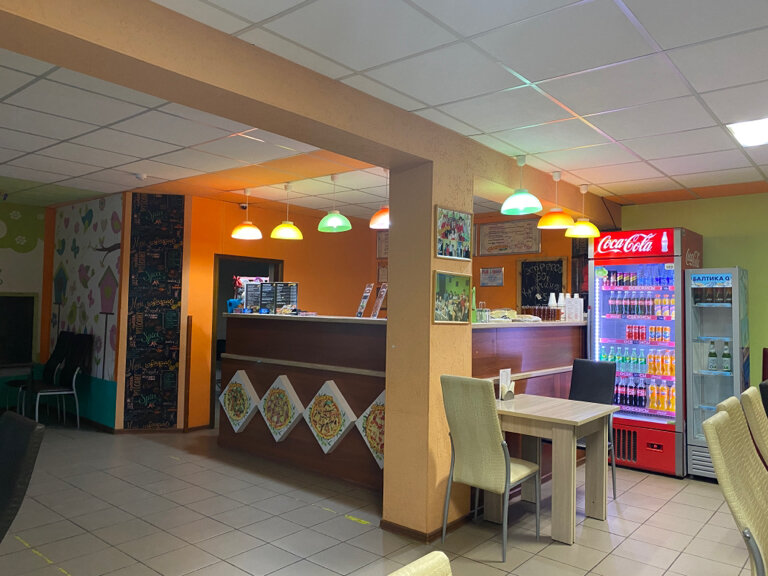 Небольшое кафе. С очень низкой ценой на пиццу, но при заказе на вынос придется доплатить 35 рублей за каждую коробку и 7 р за пакет. Пицца норм, но будьте готовы, что в мясной пицце вместо колбасок будет сосиска. Гораздо вкуснее и выгоднее кушать в самом кафе. Кафе небольшое и столиков немного, работников тоже пара человек, но они приветливые и вроде бы за всем успевают. Готовят тоже быстро - 10 минут примерно на пиццу. В кафе есть приличный туалет. в целом кафе на 4. еда не изысканная, но и цены невысокие. большой семьей зайти и покушать пиццу можно очень бюджетно на 5 человек: в 1000 рублей войдет: 2 пиццы + литр морса + бокал пива.