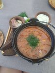 Свинина, картофель, лук, перец болгарский, томаты, грибы, огурец соленый,соус красный
