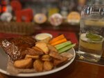 Свиные ребра с деревенским картофелем морковными палочками и овощами