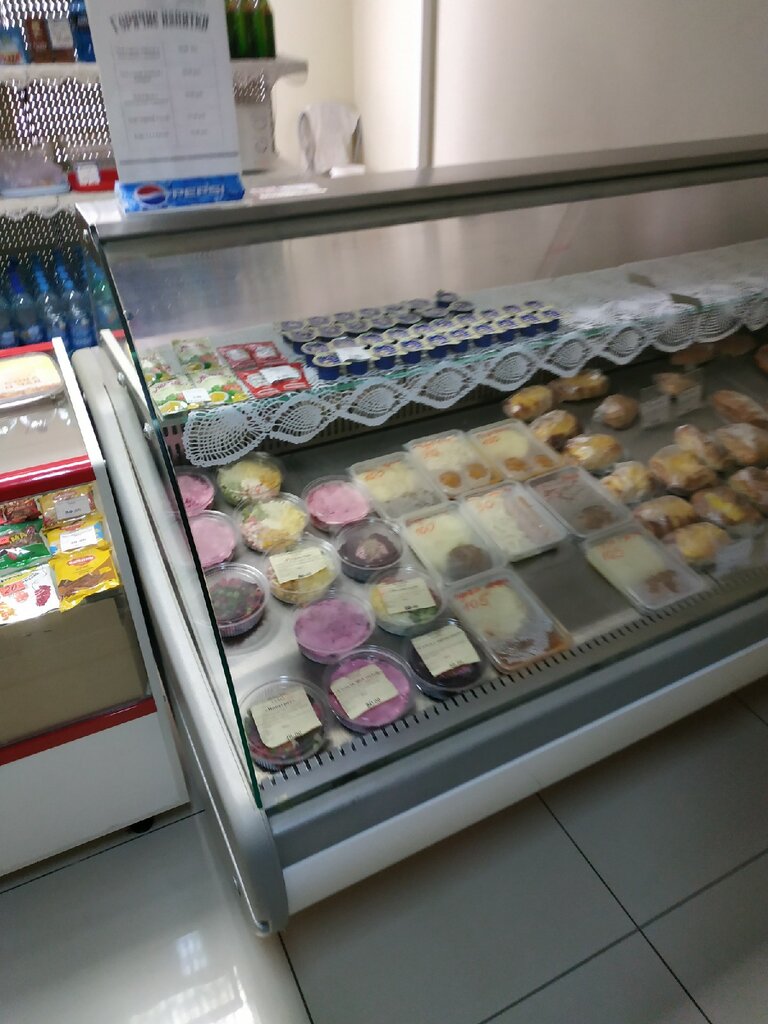 Есть небольшой выбор блюд, салатов, печенья, бакалеи Уровень обычной столовой Но норм Все время одна и та же продавщица. Адекватная женщина Можно через телефон оплатить Есть столики для поесть Тот вариант, когда из дома не взял, а в кафе бежать далеко