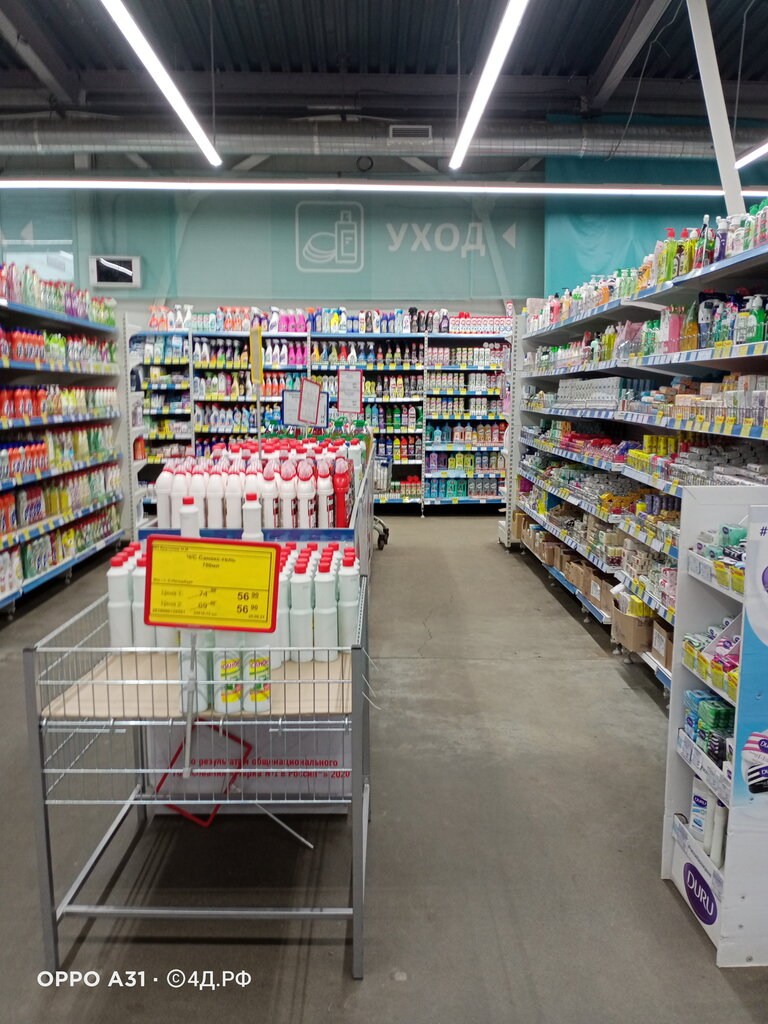 Хороший магазин. Большой выбор. Качество товаров разное, есть действительно качественный товар. Овощи и фрукты всегда свежие. Персонал как везде- нейтральный. Скидок очень больших нет, цены как везде. Кассы работают почти всегда все. Расположение для нас удобное, на выезде из города. Свежее мясо и молочка.