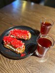 Борщ подаётся с ароматным паштетом из сала и гренками из бородинского хлеба