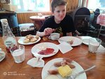 Отдыхали на базе отдыха в конце октября. Остановились в финском домике, т.к. только в нем возможно размещение с животными, были с собакой. За собаку взимается небольшая плата, 300 р./сутки и обязательное условие, прогулка с пакетиком :) Сами домики уставшие, конечно, но цена адекватная, поэтому, закрыли на многое глаза. В домике две комнаты: одна с большой, двуспальной кроватью, вторая- с двумя раздельными кроватями. Санузел с душевой кабиной и унитазом. Есть чайник, холодильник, микроволновка. Из посуды 4 чашки с чайными ложками и 4 тарелки. Приборов нет. В комнатах и коридоре теплый пол, в комнатах и санузле так же есть батареи, было тепло. У каждого домика есть мангал. Мы заказывали завтраки, обеды и ужины. В первый день завтракали только мы, и завтрак был шикарен!!! Последующие дни был шведский стол. В обед и ужин-порционное накрытие. Все съедобно, вкусно! В ресторане так же можно заказать еду и напитки по меню. На территории есть детская площадка и мини-зоопарк (кролик и енот). Недалеко есть веревочный парк.
