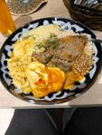Кафе для «поесть». Отличия от советской столовой: посетитель выбирает еду и заказывает её по картинке у кассы. Затем еду принесут помощники (рука не поднимается назвать их официантами) на выбранный стол. Убирать за собой посуду также не надо. Качество еды: без изысков, но нажористо. На фото бифштекс (котлета) с гарниром (яйцо в виде сердца, макароны, картофельное пюре, рис и гречка). Это не монтаж. Так и было подано блюдо. Компот же оказался довольно вкусным. Пожалуй, если окажусь там в другой раз, то пойду (через дорогу) в кафе с названием «Ели не бухтели». Хотя может название предупреждает, что не стоит
