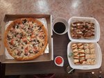 Пицца вкусная, недорогая. Это все плюсы. Роллы вроде сносные, но пробовали вкуснее. Девушка (которая проверяла заказ) сказала, что доставка максимум 2 часа. Мы прождали 3 и это с учетом того, что уже был вечер (≈8 часов) т.е пробок не было. Из-за долгой доставки пицца была уже холодная, горячие роллы без хруста и тоже холодные. Покупать можно, но желательно забирать самим.