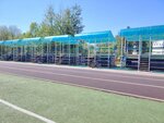 Огороженный стадион 400м. Есть трибуны с козырьком, площадка с тренажёрами и площадка для игровых видов. Бесплатно.