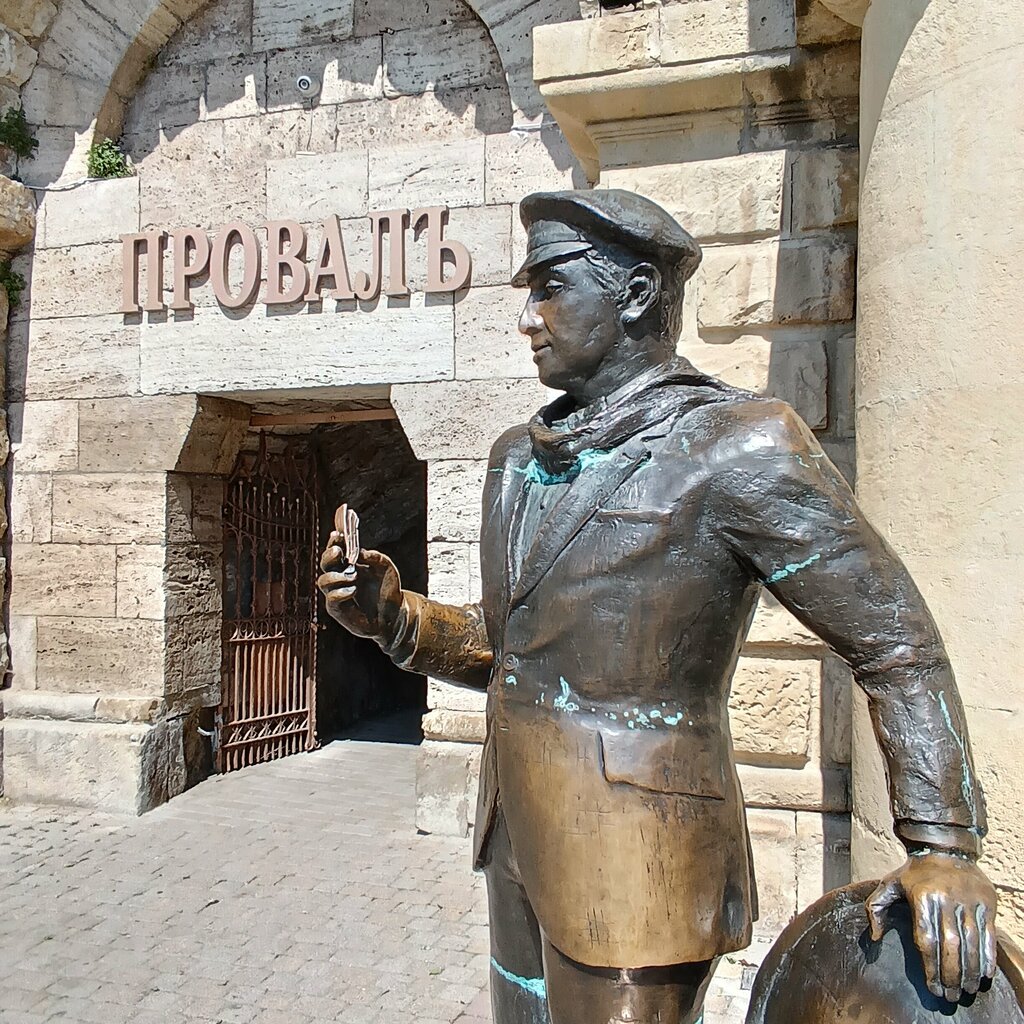 Интересная скульптура. На входе в Провал установлен Остап Бендер, продающий билеты за вход, и это не спроста. Именно он в произведении "Двенадцать стульев" придумал брать деньги за просмотр.