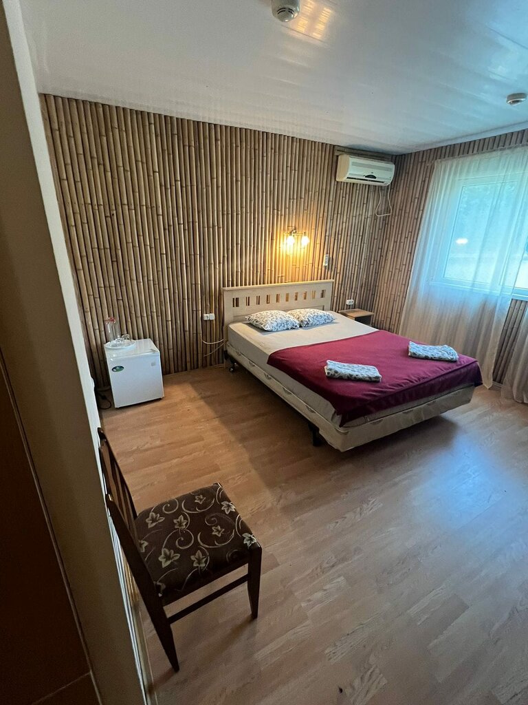 We lived here for 2 nights. We didn't have to choose, we took what we had. A day cost 3t. Individual houses made of ... and sticks. The house has a TV, a refrigerator, a 2-bed bed, a bathroom combined with a boiler, a refrigerator. There is a refrigerator, but it does not close, you need to prop up the door with a third-party object. The audibility is strong: you can hear the road, you can hear the neighbors, but the background is quiet. Su causes slight dislike, the floor under the toilet is sinking, the tile is about to fall off. There is mold under the carpet in places. The doors to the house are locked for interior doors, consider in no way. The smell in the house is not pleasant, it does not fade. There is no ventilation in the SU. The illumination is weak. It takes 20-25 minutes to walk to the sea. There is a shared kitchen outside, it has a large refrigerator and all kinds of cooking utensils. Geese and ducks walk freely in the territory.