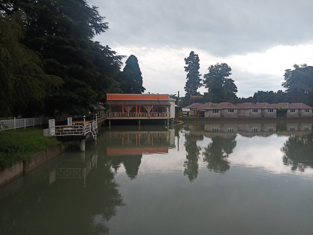 For two years I dreamed of getting into this "park hotel". I got it... It's a good idea, I think it was 15 years ago. And that's it. Nothing has been updated. Everything is old and shabby. The tile is double-walled, does not work. The dumplings were cooked for an hour. The lake is rotten water, the water from the houses drains into the same place, in the evenings the smell is terrible. The audibility in the houses from the neighboring ones is excellent. All the intimate details of the neighbors' lives unwittingly become public. The plastic tables are dirty and gray from age and lack of care. It's a long way to the sea, there are no shops nearby. Yes, the sea in this place is mixed with the Bzyb River, and the "spots" are cold. The right hand is rowing in icy water, and the left foot is in more or less warm water. From a pleasant and positive point of view, this is the manager Nurik - Nikolay) a very pleasant and responsive person. He tries to please all vacationers. The dog, puppies, seals, kittens, ducks and a couple of geese are very popular with children. I want the place to be put in order.