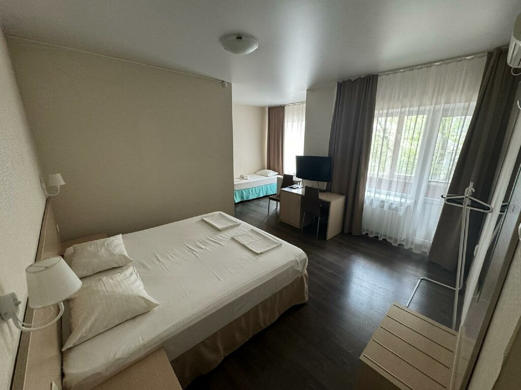 С первого взгляда симпатично, но затхло. Не логичная расстановка мебели: телевизор стоит на тумбе и закрывает зеркало полностью. Если сесть за стол, то зеркало сдвинуто влево, ты с краю в него смотришься. Из - за короткого шнура у тв, тумба-шкаф не доходит до стены стул и столы из разных эпох. Декоративные Наклейки на стенах отходят. Плитка в ванной лежит, а не уложена. Вода не горячая, но нормальна, помыться можно. В ванной прохладно. Унитаз хороший, сантехника так себе надо мыть. Шторка внизу край ржавый надо заменить или отстирать. Ванная чистая. Лампочка и розетка в Зеркале не рабочие. При входе тамбур 80*80 см и из него четыре двери в ванну, санузел и комнату и входная!))) Слышимость за двумя дверьми великолепная-- слышно как чешками волочат по полу. Холодильник, вода и микроволновая в общем коридоре. Зимой прохладно. Белье хлопковое, матрац удобный, кровать большая, одеяло вроде не синтетика, подушки большие наполнитель синтетика, шторы оборванные с петель, на балконе два захудалых стула, стола нет. В комнате нет кондиционера или пульта от него, зимой не погреешься. Вай фай хорошо работает. Парковка на улице городская. Персонал вежливый приятный. Общее впечатление развалин. Пойдёт, но не особо рекомендую.