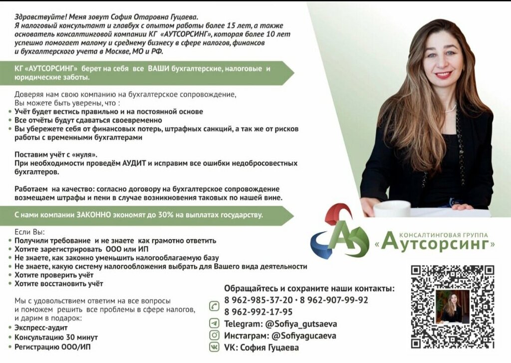 Желаю выразить свою благодарность организации КГ Аутсорсинг, в частности лично Софии ! Неоднократно для получения квалифицированной бухгалтерской услуги я обращался в КГ Аутсорсинг, непосредственно к Софии. Она очень грамотный специалист, настоящий ПРОФЕССИОНАЛ своего дела и приятный человек в общении, всегда поможет и подскажет. Обладает широким кругом знаний не только в области бухгалтерского учёта , но и в вопросах системы налогообложения. Всегда свою работу выполняет качественно, в срок и на все 100 процентов, без каких либо нареканий.