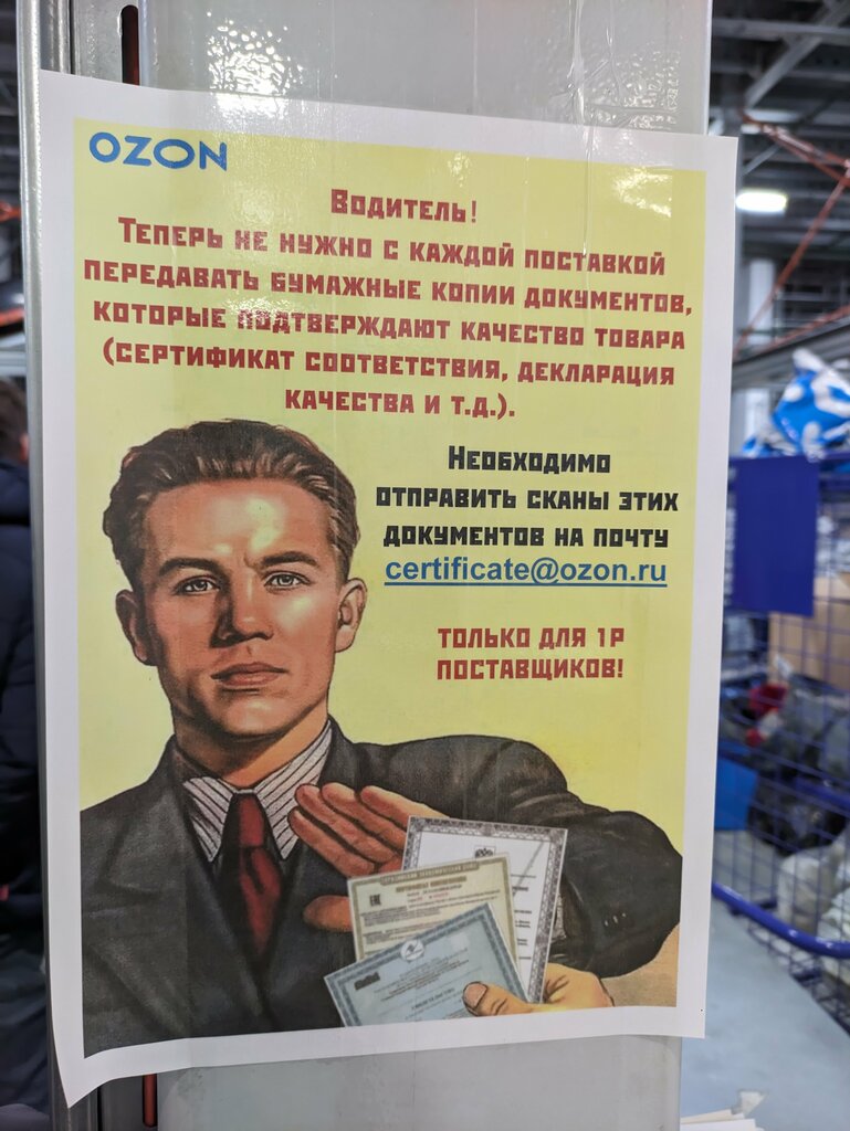 I was picking up an oversized order. I want to warn you right away: the PVZ is located at gate #39, and these gates are on the back side of the warehouse. We pulled into the parking lot in front of the warehouse and circled it from either side. Once inside, there is a large sign on the left "FBS self-acceptance" and below there is a small sign on the pillar "PVZ" that you can barely notice. There are usually sellers stomping around who hand over the goods. Don't stand there, don't wait, but catch any employee and tell them that you want to pick up an oversized parcel. And even then, you'll have to wait. I'd like to give you 1 star for navigating the warehouse.