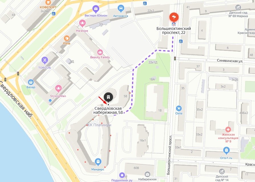 Синявинская улицаБольшеохтинский проспект, 22Шоссе Революции, 3Администрация Красногвардейского районаШоссе Революции