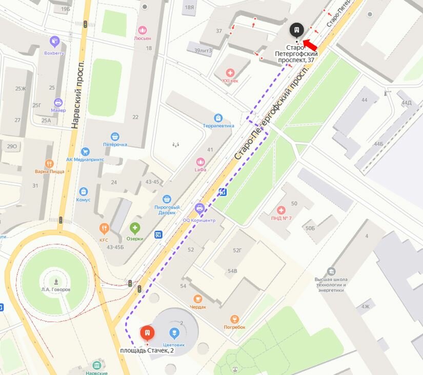 Stachek Square – Narvskaya Metro StationNarvskaya Metro StationStaro-Petergofskiy AvenueObvodnogo Kanala EmbankmentObvodnogo Kanala Embankment, 150
