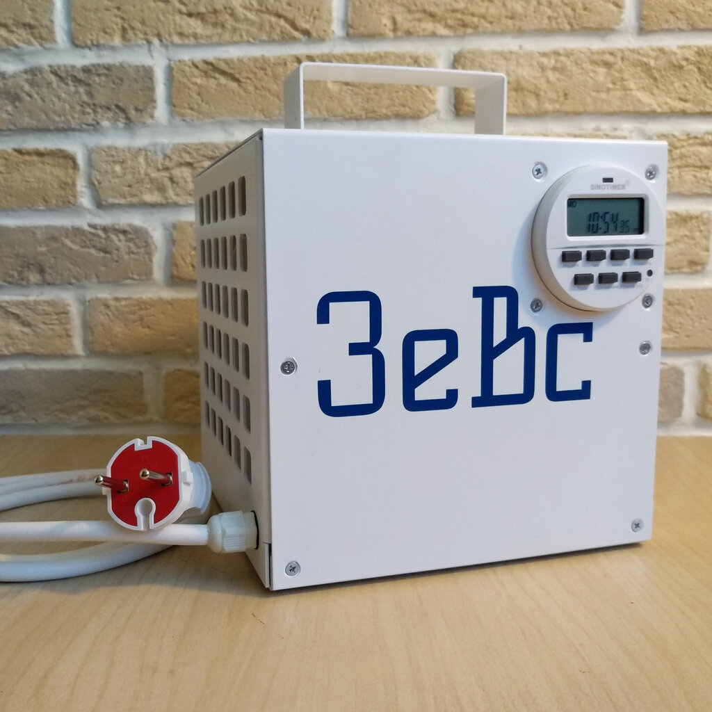 вырабатывает 10г озона в час, воздухообмен 200куб.м./час, таймер на 16 программ, отложенный запуск, сделано в РФ, гарантия 1 год, для помещений до 110кв.м.