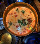Версия традиционного супа том ям,наиболее приближенная к оригиналу, приготовлен на курином бульоне,с добавлением кокосового молока,грибов и томатов так же добавляются стебли лемонграсса,свежий перец чили, имбирь и лук. Подается без риса.