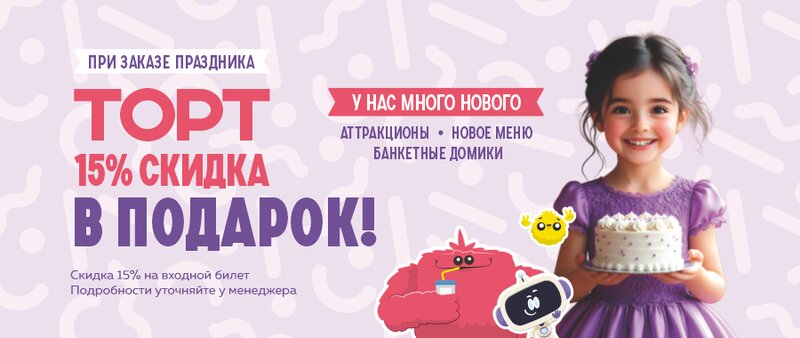 На нашем острове, именинника и всех его гостей ждёт вкусная еда от шеф-повара, шустрые официанты, весёлые аниматоры, более 30 аттракционов, мастер-классы, шоу-программы, уютные домики и ещё море других дополнений для яркого праздника.