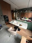 Главная зона квартиры — просторная кухня-гостиная, наполненная светом и текстурным разнообразием. Деревянные панели, бетонные поверхности и графитовые элементы создают баланс между современностью и природной эстетикой.