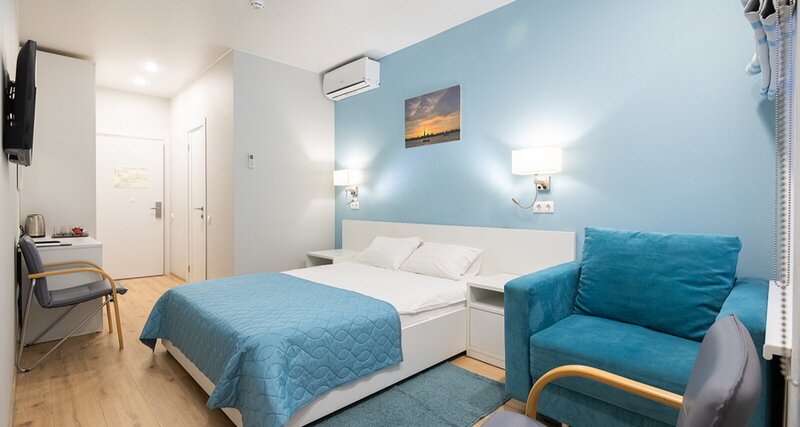 Двухместный номер площадью 15 кв метров. Так же в номере: сан узел с душевой, фен, полотенца, косметический набор, сейф, холодильник, чайная станция, кондиционер.