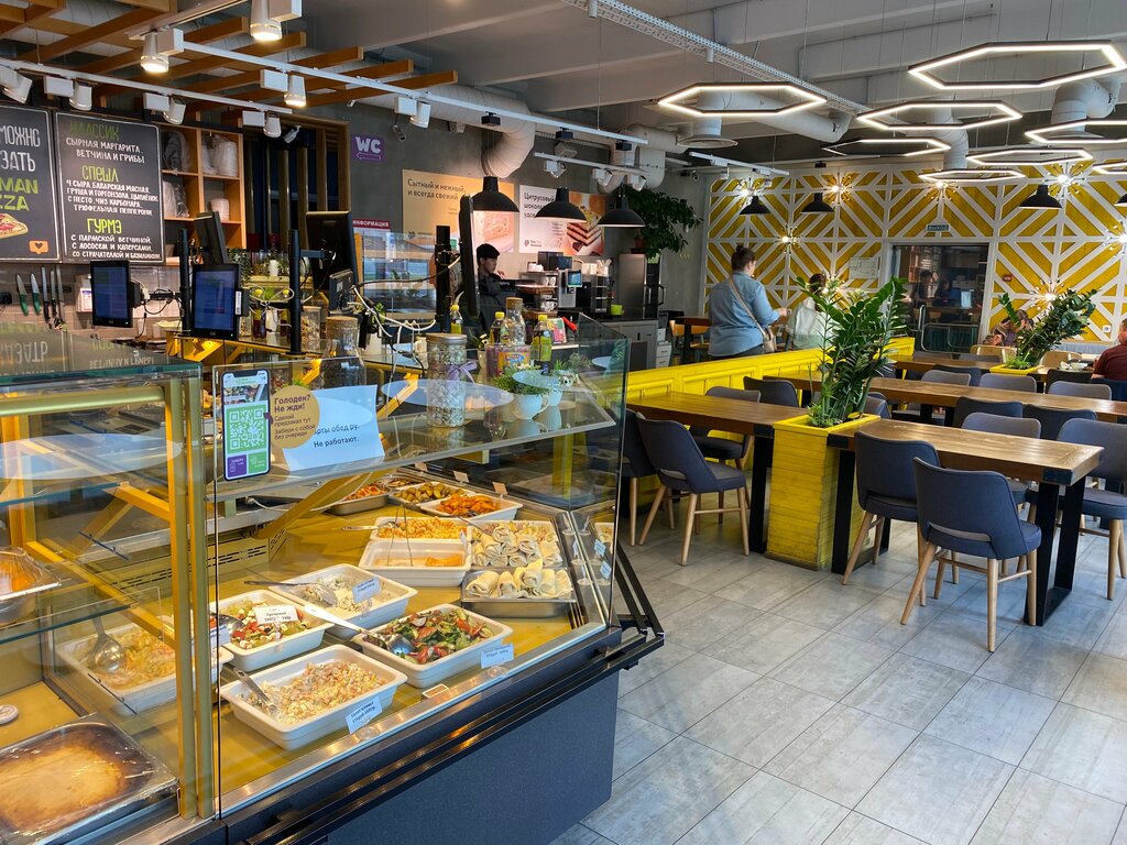 Очень потрепанное место в плане мебели и столов. Расположение удобное, сотрудники очень вежливые. Еда средняя. Нет желания долго сидеть, покушал-ушел.