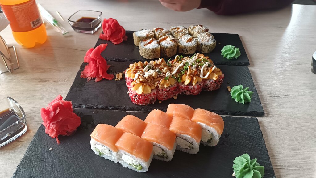 Нормальное кафе, но уж больно медленные, при том, что было мало клиентов, работают не очень расторопно. Но еда (из того, что брали) съедобная. В меню много видов суши(не брали), пицца и разная мелочёвка. Есть вольер для детей (до 7 лет, так написано) в нём есть горка и много шариков, наверное детям зайдёт, но без присмотра маленьких я бы не стал там оставлять. Парковка нормальная, от трассы не далеко, так что можно съехать и перекусить. Рядом есть простенький автомагазин...