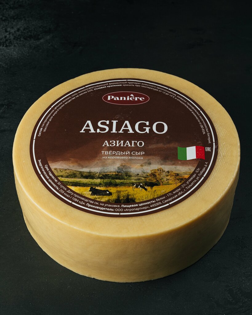 Производится по рецепту и технологии сыра Азиаго (Asiago) с вызреванием 20-30 дней. Этот сыр относится к полутвердым итальянским сырам. Светло-желтый, с крупными дырочками, отличается нежным вкусом и необычным сырным ароматом.