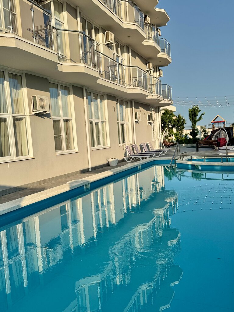Отдыхали в июле 2025, брали двухкомнатный номер - отдельная спальня и общая комната с двумя кроватями и панорамными окнами . Отель новенький, недавно построенный, везде чисто аккуратно , кровати удобные, подушки нормальные, одеял нет, вместо этого маленькое пледы - это не очень удобно , сомневаюсь, что их стирают после каждого гостя , а мы не любим спать под простынками ... Очень мало места для для размещения вещей , один шкаф с тремя полками и двумя вешалками 🤭( это на 4 человек) , шкаф без двери ! Кондиционеры в номере пора чистить, они совсем не справляются, особенно в комнате с панорамными окнами, там вообще духота , даже с учетом того, что кондиционер стоял на самой минимальной температуре круглосуточно ! В номере ниразу за 5 дней не убрались ((( один раз поменяли полннца т вынесли мусор . на территории находится столовка с очень минимальным меню и небольшим периодом работы . Есть так же бар, где есть кофе, пиво, вода и мороженное . Подогреваемый бассейн на территории неплохой, но лежаков постоянно не хватает , их там штук 6 всего и не хватает мест, где можно просто посидеть и отдохнуть , лавочка толко одна и одни качели. На ресепшене никогданет администратора, она выполняет другие функции , то в буфете, то еще где-то... А утром, когда мы выезжали , было около 7.30 вообще так никого и не нашли , положили ключи на стойку, так и уехали. На территории запрещено курить, но персонала этот запрет не касается ))) Что касаясь пляжа, до него идти минут 7-10. пляж в этом месте широкий песчаный, но вход с большими
