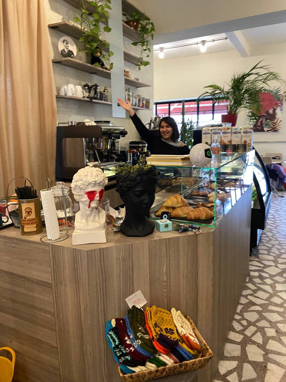 We stayed side by side at the hotel, went to this cafe for breakfast. Satisfying, delicious. * We had coffee and hot cheese sandwiches, served with olives, sauce, vegetables, eggs. The service is good, the food was not long in coming. The choice is small, but for every taste: for lovers of sweet, meat, and vegetables. The price is average, not cheap. But it's delicious and quite a lot. Inside the cafe is a shop with beautiful jewelry.