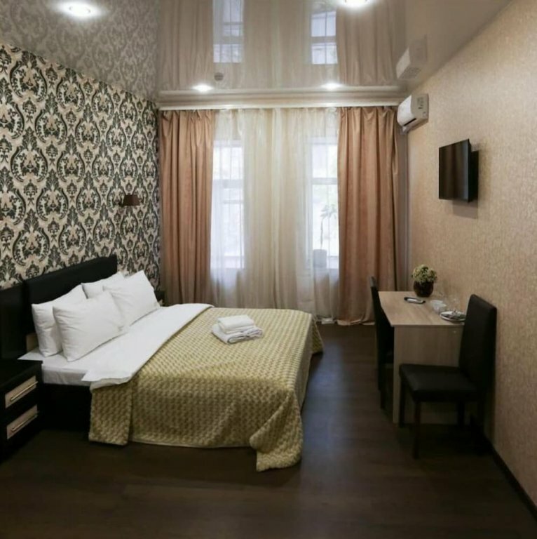 Стандартный номер (номер 1) На фотографиях в агрегаторе его нет. Фото: только тут в отзывах посетителей узнаваемые дыры на кровати и в Гугл.Картах - общее фото. Минусы: - номер меньше заявленного (кровать у стены, проход с одной стороны, узкий шкаф, проход со столом в нем на ширину стула напротив ванной, душевая кабина узкая даже для женщины средней комплекции), - потрепано все (от болтающейся ручки входной двери до отклеивающихся обоев и протертой в центре простыни, прозженные или протертые дыры в изголовье кровати - ужас) - в коридоре духота - нет гигиенических принадлежностей (один пакетик шампуня, рулон бумаги, полотенца - маленького размера, тапки дали на входе, нет - ни полотенец для тела, ни коврика для душа), - стены - по звуку гипсокартон, все, что в коридоре, - слышно, а номер у входа, - вода в душевой сходит плохо. Плюсы: - центр города, 10 мин. пешком до метро - вежливый персонал, порекомендовали по времени вылавливания свободного номера день в день - симпатичные фото на стенах, некогда приличные обои, - в целом чисто - окна - на относительно тихую улицу Итог: выбирать другие отели, если везде занято - сюда только в улучшенный номер, предварительно уточнив площадь и состояние. Мне было неловко за такой выбор перед самой собой, но ответственность - на отеле за несоответствие заявленного и фактического.