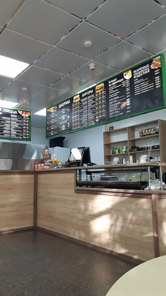 Для своего уровня неплохое место. Только это не кафе, больше похоже на столовке, есть пирожки, сосиски в тесте, какие-то булки, кофе, чай, какао, мороженое. Бургеры, шаурму, картошку фри нужно ждать, что в принципе логично и правильно. Но котлеты в бургерах не свежие, а просто разогретые. Столы чистые, много посадочных мест, есть кран с водой, чтобы помыть руки, а вот туалета не заметила. Мы забежали с детьми во время дождя и обнаружили много молодых людей возраста старших школьников. Вот как раз на них и ориентировано сие место. Специально идти сюда, чтобы накормить детей или отметить день рождения точно не стоит.