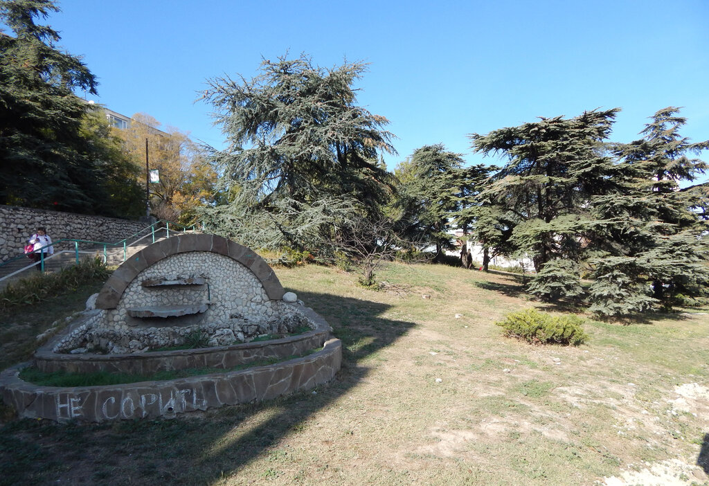 Никто парком не занимается, засохшие кедры и сосны не спилены, новые деревья не посажены, кустарник засох, фонтанчик не работает.